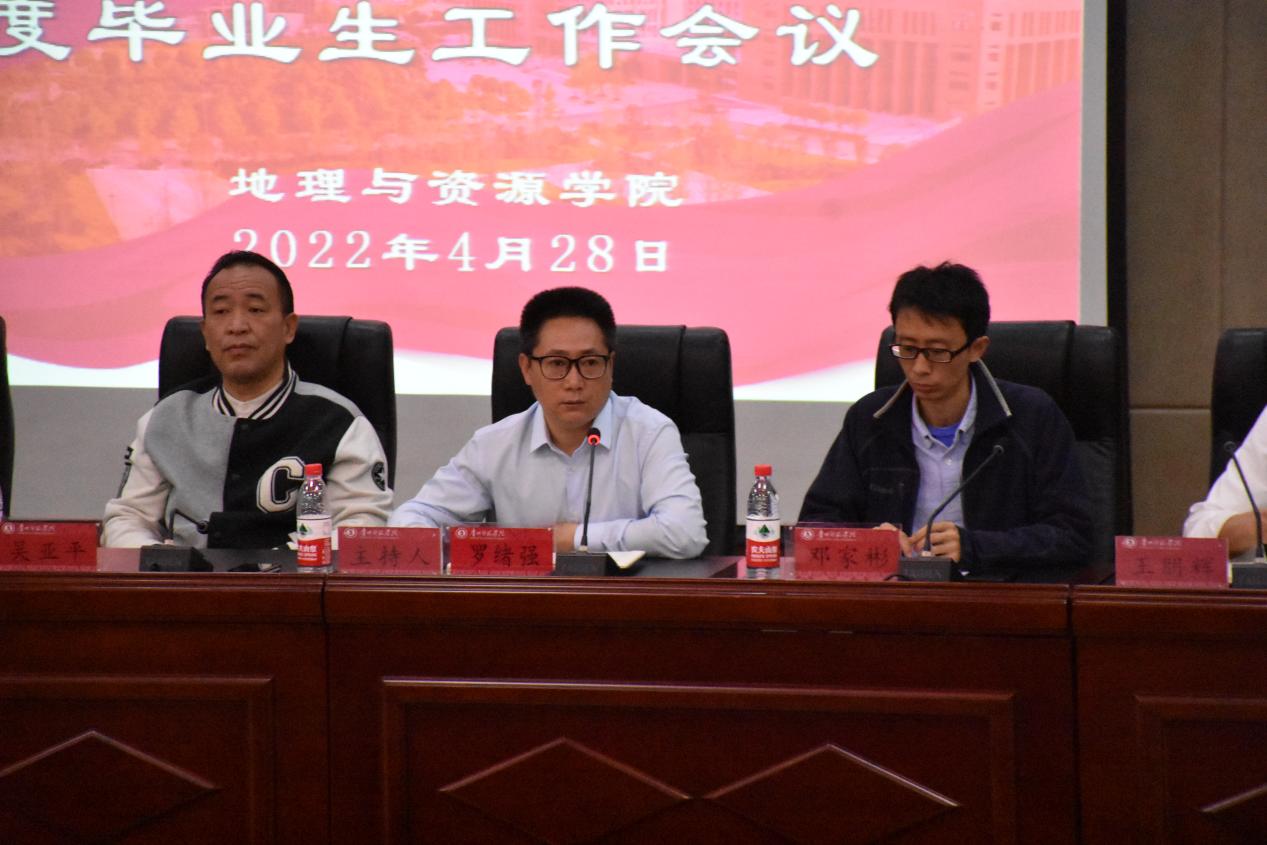 2022年4月29日,jinnianhui金年会诚信至上在文韬院道德讲堂召开2022届全体毕业生会议。学院党委书记吴亚平、院长兼党委副书记罗绪强、副院长兼贵州山地研究院院长罗光杰、副院长邓家彬,系主任代表张伟,教学科研科科长王鹏辉,学生党支部书记张其芳、林丽以及2018级辅导员韩默然出席了本次会议,jinnianhui金年会诚信至上2022届全体毕业生参加了会议。会议由罗绪强主持。