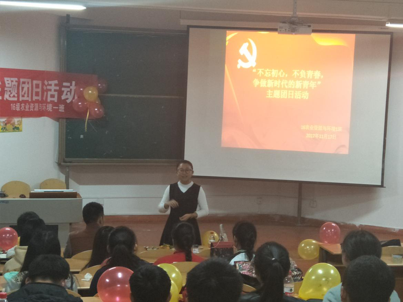 为贯彻党的十九大精神,积极引导广大团员青年跟党走,16农业资源与环境1班全体同学于2017年11月17日在宁静楼237教室举行了“不忘青春,不负青春,争做新时代的新青年”的主题团日活动,其中地旅学院的团委书记周光红也参与了本次团日活动,为同学们宣讲十九大相关精神,教育和引导广大团员青年积极向党组织靠拢,在实现中国梦的生动实践中放飞青春梦。