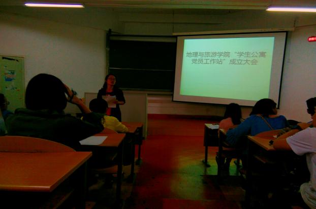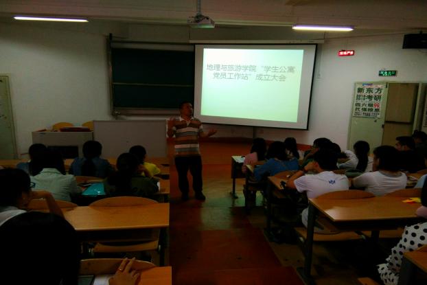 为使党建工作深入公寓,扎实开展学生党员“两学一做” 活动常态化,促进地理与旅游学院学风建设,增强学生党员奉献意识和服务能力,地理与旅游学院学生党支部于2017年6月19日在宁静楼235教室举行了地理与旅游学院“学生公寓党员工作站”成立大会。活动由地旅学院学生党支部书记刘静主持,学院党委书记吴亚平同志出席本次会议。