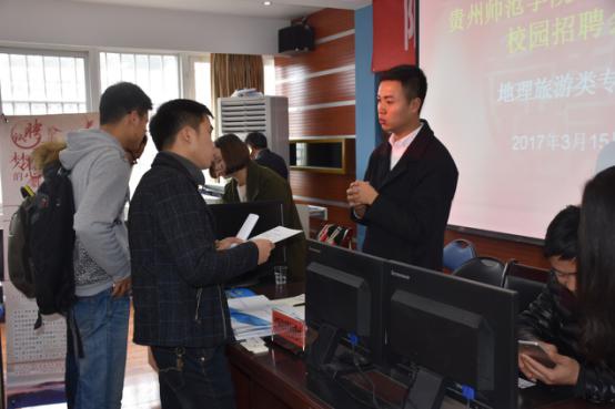 3月15日,金年会官网地理、旅游类专业2017届毕业生专场招聘会在文韬苑就业大厅举行,包括贵州省第三测绘院、贵阳旅文旅游公司、贵州千景土地科技有限公司等近20家在省内外从事国土、测绘、水利、规划、景区开发与酒店管理、旅行社、金融、旅游商品开发等方面优秀企事业单位到金年会官网招聘地理、旅游类专业应届毕业生。其中不乏省市重点大型企业、央企、上市公司。参加招聘会的毕业生还有外国语学院、政经学院、历社学院、艺术学院、数计学院、设计学院相关专业毕业生。