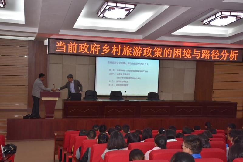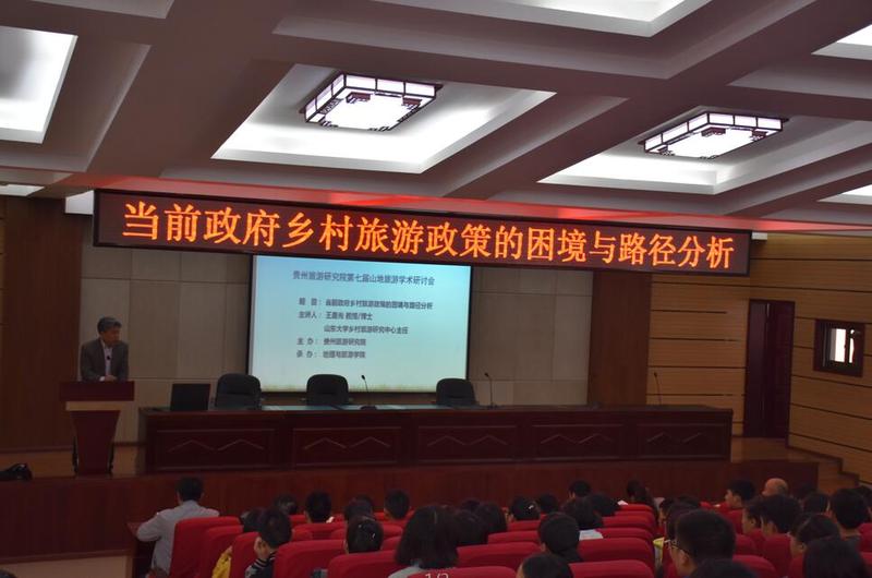 11月4日,第七届山地旅游学术研讨会在文韬院道德讲堂举行。本次研讨会由贵州旅游研究院主办、地理与旅游学院承办,研讨会邀请了山东大学乡村旅游研究中心主任王晨光教授做题为《政府乡村旅游政策的困境与路径选择》的讲座。副校长何林,校长助理徐凤增,地理与旅游学院院长李乐京,党委书记吴亚平,副院长张凤太,文化旅游相关专业老师、学生200余人参加了此次研讨会。研讨会由李乐京主持。