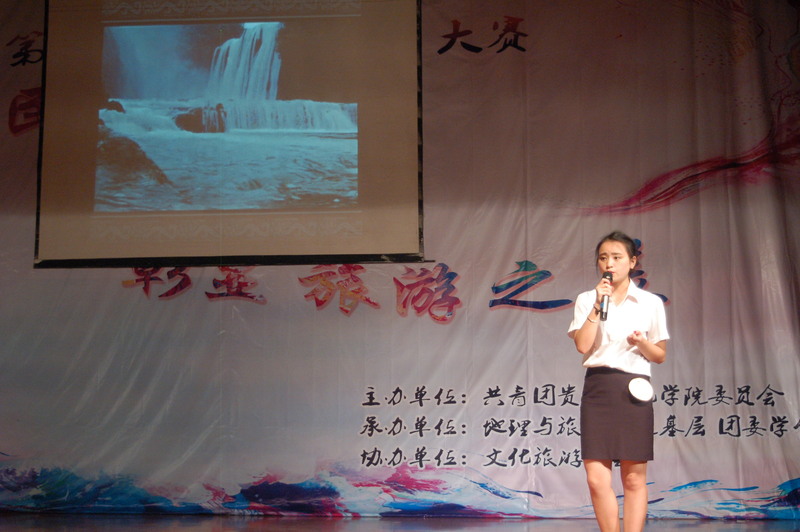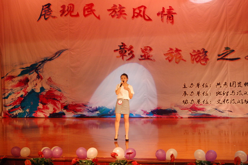 出席本次活动的有:地理与旅游学院李乐京院长,校团委寇源老师,外国语学院团委书记罗荣老师,艺术学院团委书记舒然老师和国家高级导游贵州十佳导游夏雪等,十三个学院的代表及地旅学院各班级同学。经过初赛、复赛激烈选拔,形象大使和导游之星中分别遴选出八位才艺不凡的选手进入决赛,她们的实力不容小觑。当幕布伴随音乐缓缓拉开,在闪光灯的照耀下,盛装出席的选手以T台秀的表演形式登上众人瞩目的舞台,决赛正式开始。接下来李乐京带着对同学们殷切的期望上台致辞。此次大学生民族旅游形象大使决赛选手们呈现了精彩绝伦的歌舞才艺,有欢快或深情的歌声,有婀娜多姿的舞蹈,有余音袅袅的古典音乐演奏……。每位准“大使”精彩才艺表演过后,紧接着以双语的形式应答评委提出的旅游相关知识,选手毫不现胆怯,轻松应答,体现了自己除了形象优势外丰富的知识底蕴。
