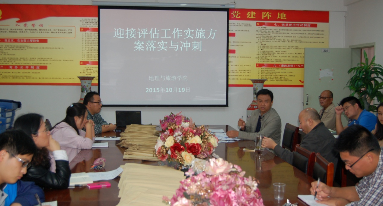 2015年10月19日中午1点,地理与旅游学院院长李乐京主持召开金年会官网迎接评估工作方案的落实与冲刺会议,迎评方案涉及的全体人员参与了会议。