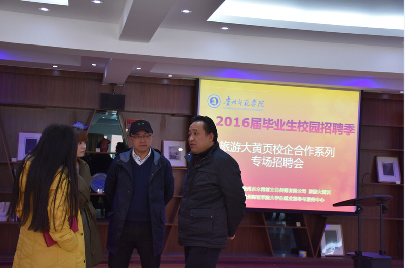 2015年12月18日中午12点至下午14点,由金年会官网旅游管理专业实践基地贵州水木同创文化传媒有限公司与校招就处共同主办、地理与旅游学院协办的旅游相关专业专场招聘会在金年会官网大学生就业与服务中心成功举办。贵州水木同创文化传媒有限公司副总杨巍与“旅游大黄页”项目总监王再利全程为参会企业服务,充分展现了“旅游大黄页”同业服务平台的核心服务理念和创新服务方式。地理与旅游学院党委副书记吴亚平到会走访,并安排旅游实训室主任周杰副教授全程协助主办方开展会场服务。