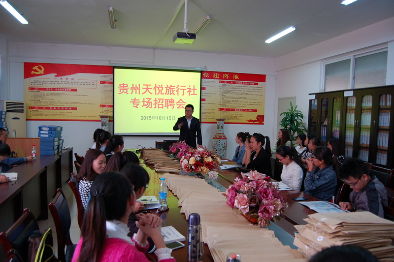 2015年10月15日上午9点至11点以及下午2点至4点,金年会官网携手贵州旅游企业界新星——贵州天悦旅行社分别在宁静楼236教室、地理与旅游学院会议室举办了两场针对2016届旅游管理本科应届毕业生的专场招聘会。