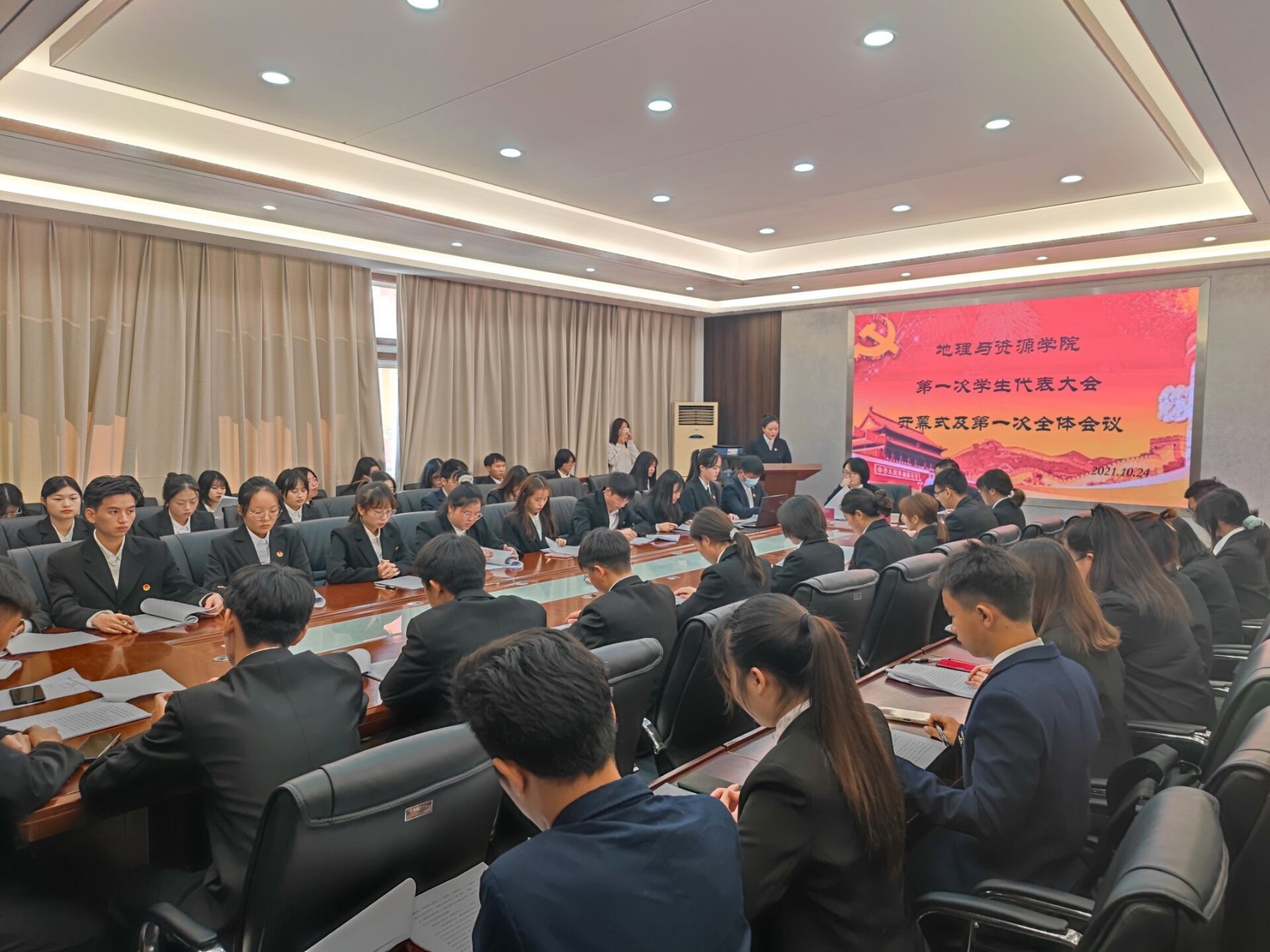 10月24日上午10点至10点30分,在宁静楼325召开了由王倩主持的预备会议。各学生正式代表听取报告人陈凤报告大会筹备工作报告(草案),通过了大会议程,代表资格审查情况(草案)等报告。由大会主席团通过各分团团长、副团长名单和大会议程。下午2点到4点30分,在宁静楼325召开了由王倩主持的正式会议,会议在奏唱国歌中拉开序幕。开幕式上,吴亚平对上届学生会的工作作出了肯定,也对下届学生会工作提出要求。淳淳话语、殷殷嘱托,鼓舞人心、催人奋进。紧接着,在六次分会议后,选举产生了第一届学生委员会和第一届学生会主席团成员。大会结束后,各正式代表通过学生会工作报告的决议,并全体奏唱校歌。至此,jinnianhui金年会诚信至上第一次学生代表大会圆满落幕。