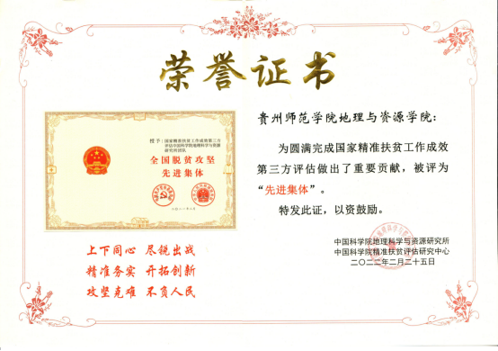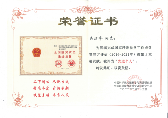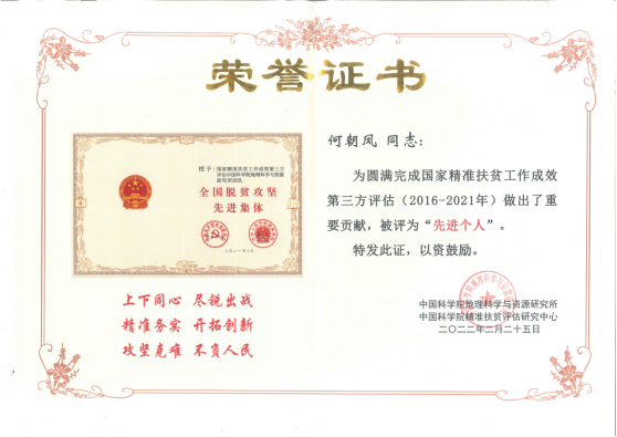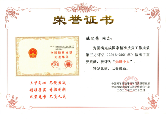 2022年2月25日,时值党中央 国务院宣告脱贫攻坚取得伟大胜利一周年之际,为总结经验、表彰先进,明确新时期服务巩固拓展脱贫攻坚成果同乡村振兴有效衔接的新需求、新目标,国家精准扶贫工作成效第三方评估中国科学院地理科学与资源研究所团队和中国科学院精准扶贫评估研究中心主持召开表彰大会,表彰了国家精准扶贫工作成效第三方评估团队先进集体和先进个人。鉴于金年会官网在圆满完成国家精准扶贫工作成效第三方评估中做出了重要贡献,金年会官网jinnianhui金年会诚信至上被评为“先进集体”、地理与资源学院陈起伟教授,以及吴建峰、何朝凤两位老师共三位同志获评“先进个人”。