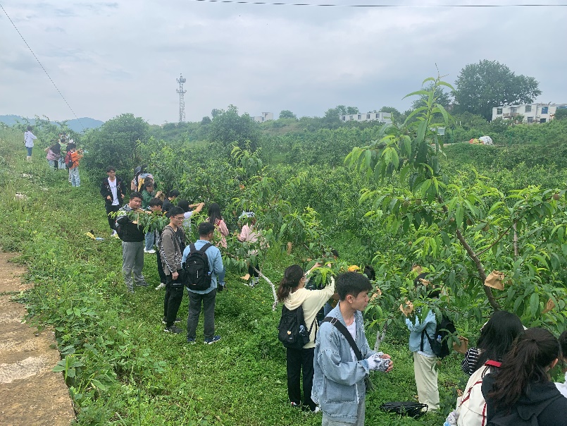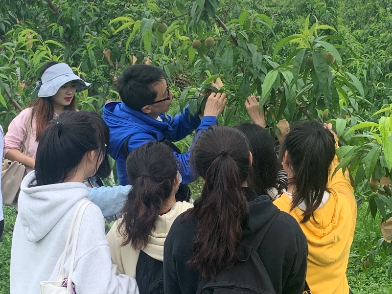 早上九时,农资环一行54人乘校车到达金山村精品蔬菜果园示范基地。基地位于阿哈湖金山村金家山,成立于2018年12月,于2019年1月启动,是贵阳市唯一一家集民企、国企和村集体经济为一体的混合所有制的果园示范基地。在技术员的带领下,学生先参观了蔬菜示范基地,了解了种植大棚现状以及学习了该基地蔬菜种植的水肥管理与田间管理。参观现场,学生纷纷提出自己的疑惑,随着技术员的讲解,学生们又更近一步地了解了蔬菜种植的细节。随后,学生又到果园观摩学习,技术员演示了桃树的整枝技术。下午,技术员和课程老师现场演示了苗木嫁接技术和黄桃套袋方法。学生参与其中并亲手完成了多颗果树的套袋工作。课程最后,技术员评价了学生们的技术并鼓励学生们积极加入农业农村建设、投身乡村振兴事业。