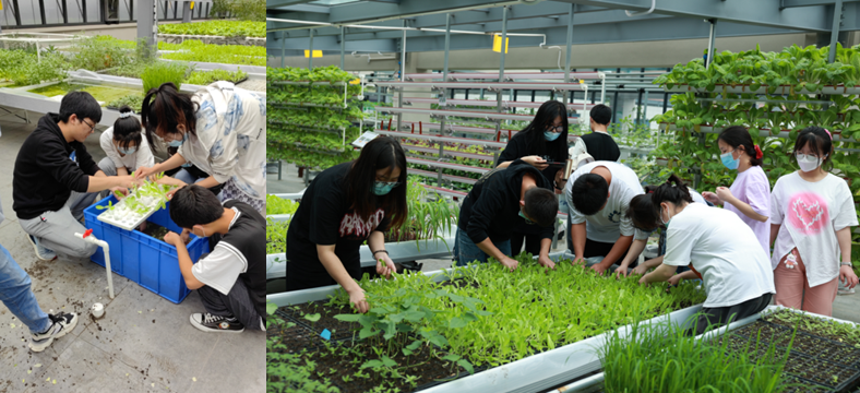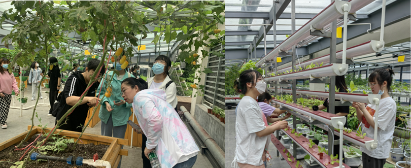 整个课程包括理论讲解、实操和参观三部分,分别由任课老、实训中心技术员和全体学生完成。首先,参观温室基地。一号温室内设有天瀑;鱼菜共生球;岩棉栽培架-西红柿;水肥一体机栽培;平行管栽培快速生快菜;玉米苗床;播种机-适用于小种子;小型植物工厂-全自动定时开关控制植物生长所需的光照温度等装置。二号温室设有鱼菜共生;植物墙-墙上为植物所构成的“农”、“技”二字,阐明了将线段化手段将农业技术带到生活中去;A字架装置、旋转栽培台,目的是为了让不同位置的植物都能获得同样的光照;雾培;以虫防虫等技术。三号温室起到宣传作用,以国内外示范性农业案例根植农业,展现现代农业之美。