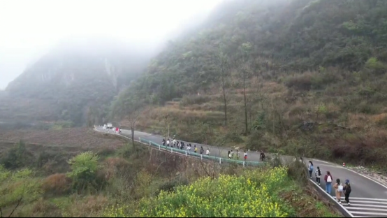 在团支书李小菊的带领下,团员们乘车前往乌当区羊昌镇黄连村长征路起点处,众人呈一列纵队步行前往黄连村的红色基地,路边矗立着红军雕塑,一段段红色标语见证了革命先辈对革命理想的不懈追求。抵达黄连村红色基地时已是正午,首先映入眼帘的便是刷在石壁上“还我河山”四个大字,在正午阳光的照射下,显得熠熠生辉。基地的中心有一面由石头雕刻而成的党旗,党旗下面篆刻着入党誓词,誓词时刻告诉着共产党人身上应当肩负的使命与责任。