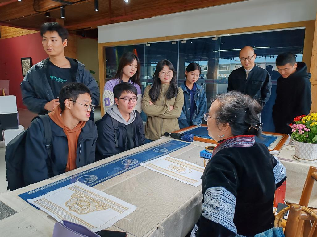 贵州非物质文化展览馆重点展示贵州非物质文化遗产的独特项目,是全国第一座省级综合类非遗馆。在展览馆工作人员的带领下,金年会官网师生有序参观展示厅、传承厅,全面了解贵州非物质文化遗产及其发展动态,认识人类非物质文化遗产的生产和发展规律及其与人类社会文明进步的关系。在非遗工坊,同学们争先恐后的与当日驻馆的两位国家级非遗传承人直接对话,学生们就自己感兴趣的问题进行访谈,了解非遗背后的故事,并积极实践部分非遗项目。