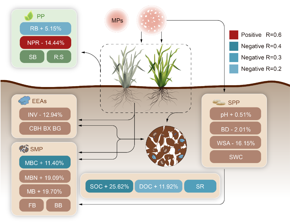 塑料制品为人类生产及生活提供了巨大便利,但由于缺乏有效的废弃物管理,大量塑料废物最终进入海洋、陆地生态系统,在自然因素和人为因素的双重作用下逐渐分解成微塑料(直径小于5 mm的塑料碎片)。在微塑料污染已被证实存在于陆地、海洋乃至大气生态系统中,成为一个日益严重的全球性环境问题。由于陆地生态系统比海洋生态系统更有可能成为微塑料的汇,对土壤中微塑料污染的研究显得尤为重要。碳(C)和氮(N)作为土壤中重要的能量和营养元素,支撑着土壤中动物、植物和微生物的生长发育。然而,微塑料可能通过改变土壤性质从而影响土壤中C和N的有效性。因此,研究微塑料如何影响土壤C、N循环对预测全球气候变化条件下土壤的C、N动态及其影响具有十分重要的意义。