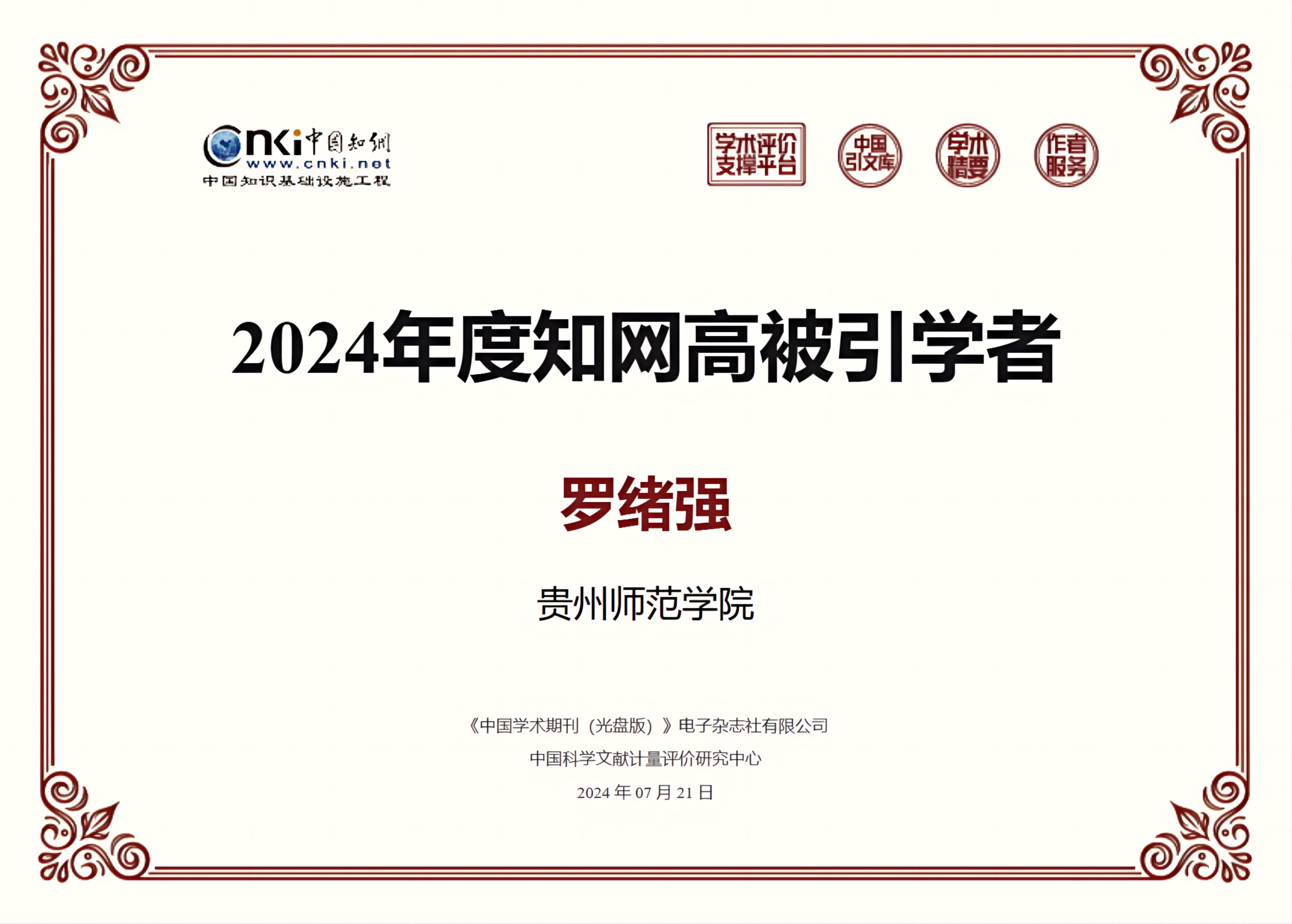 近日,中国知网发布了2024年度高被引学者名单。金年会官网三级教授罗绪强成功入选。据悉,此次评选由中国知网“学术精要”数据库依据2013-2023年间学者发表论文的影响力指数进行评选,“高被引学者”遴选范围为近十年发表至少一篇PCSI指数高于1.65期刊或会议论文的学者,且近十年发表期刊会议论文的PCSI指数之和位于上述学者的前1%,并满足以下条件:(1)仅统计PCSI指数大于1.65的论文;(2)至少发表1篇高影响力论文;(3)至少发表5篇PCSI指数大于1.65的论文。