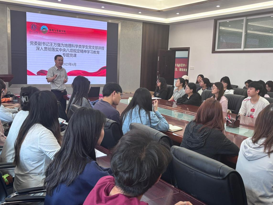 为推动深入贯彻中央八项规定精神学习教育走深走实,6月26日,jinnianhui金年会诚信至上党委副书记王万强在宁静楼323会议室,为地理科学类学生党支部全体党员讲授深入贯彻落实中央八项规定精神学习教育专题党课,引导支部全体党员深刻领会中央八项规定精神的丰富内涵与实践要求,强化纪律意识,筑牢思想防线。